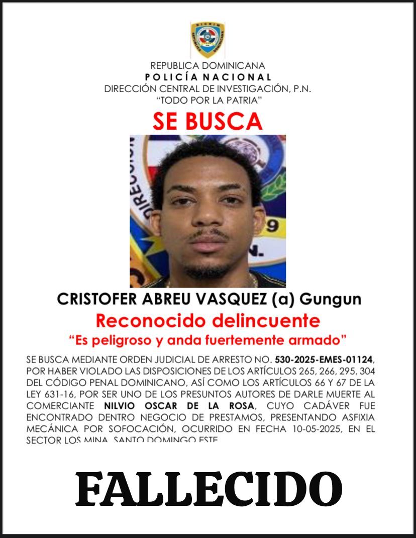 Durante esa intervención, uno de ellos, identificado como Cristofer Abreu Vásquez (alias Gungun), cayó abatido tras enfrentar a tiros a los agentes.