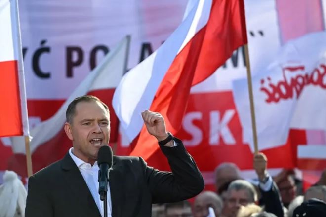 Nawrocki critica al Gobierno de Donald Tusk por ser demasiado condescendiente con Bruselas y Berlín, y culpa a las «élites europeas» de la guerra en Ucrania.