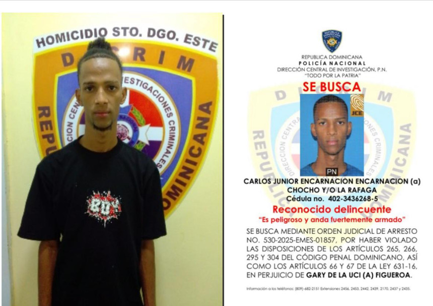 La Policía Nacional informó el apresamiento de Carlos Junior Encarnación, apodado “La Ráfaga”, de 21 años, quien era buscado por su implicación en la muerte de Gary de la UCI (a) Figueroa, ocurrida el pasado domingo 28 de julio en el sector El Almirante, Santo Domingo Este.
