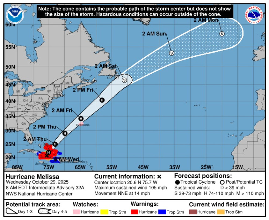 En cuanto al huracán Melissa, el Indomet precisó que el poderoso sistema, categoría 3 en la escala Saffir-Simpson, se localiza a unos 95 km al oeste de Guantánamo (Cuba) y a unos 370 km del centro de las islas Bahamas, moviéndose hacia el noreste, a unos 19 km/h, con vientos máximos sostenidos de 185 km/h y ráfagas superiores.