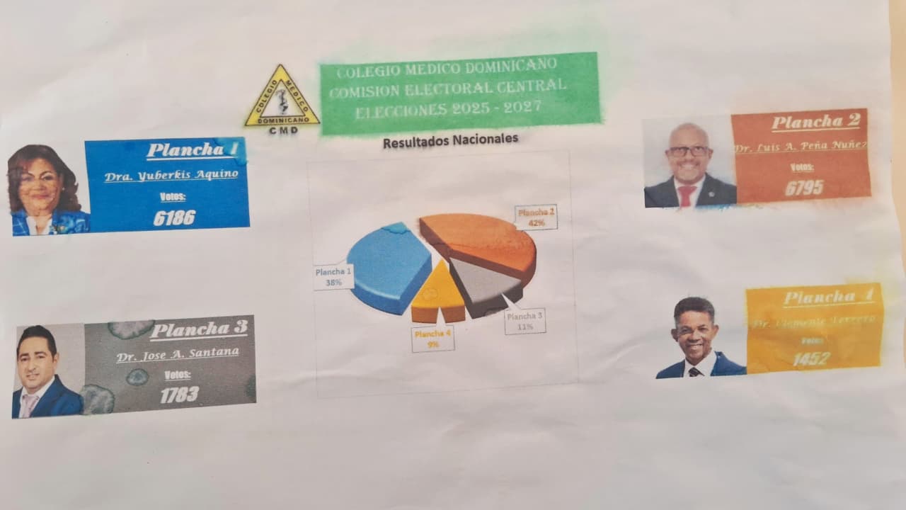 Santo Domingo.- Tras el conteo oficial de las 119 actas electorales, el Dr. Luis Peña Núñez, candidato de la Plancha 2, fue confirmado como el nuevo presidente del Colegio Médico Dominicano (CMD) al alcanzar 6,795 votos, equivalentes al 42% de la votación general. En tanto, la Plancha 1, encabezada por Yubelquis Aquino, obtuvo 6,186 votos (38%).